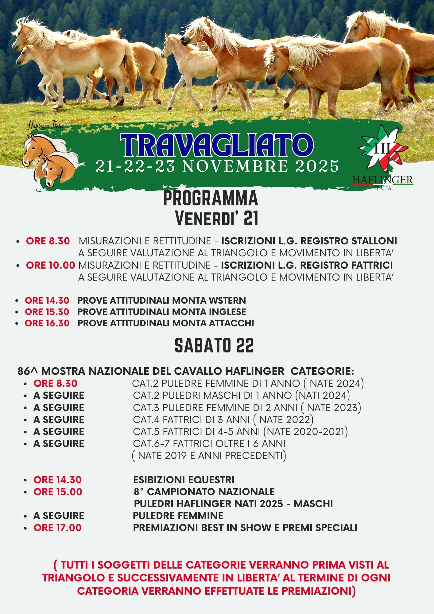 Sei in: Home1 / 86ª Mostra Nazionale del Cavallo Haflinger – 8° Campionato Nazionale Puledri – Travagliato (BS) 21-22-23 Novembre 20252 / PROGRAMMA – TRAVAGLIATO 2025 – VENERDI – SABATO